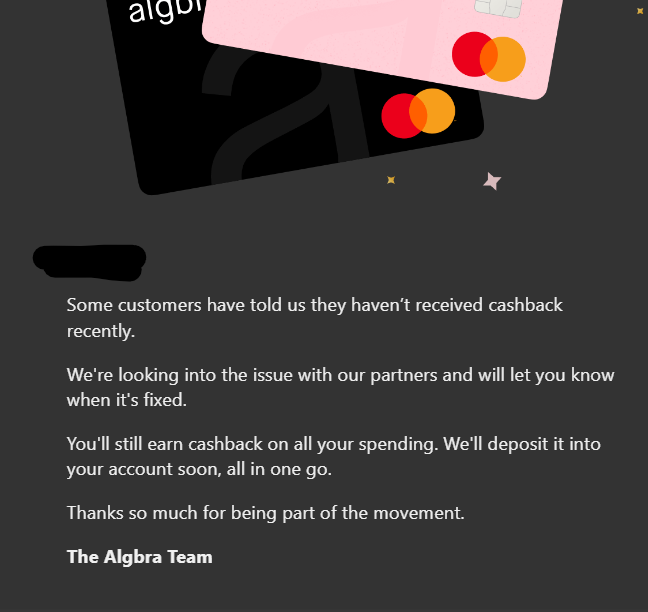 Sorry, I wasn’t really clear with what I meant. I meant that I think they had an issue with getting data from Mastercard which caused delays in identifying and paying out cashback. At least that’s how they’re playing it.