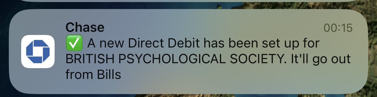 Thank you Chase for letting me know about a new Direct Debit I’ve setup.