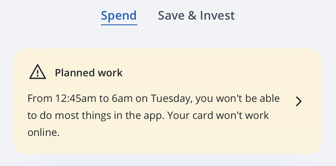 Your balance won’t update while the work is ongoing. You won’t be able to access your card details. You won’t be able to make online card payments when security checks are required either.