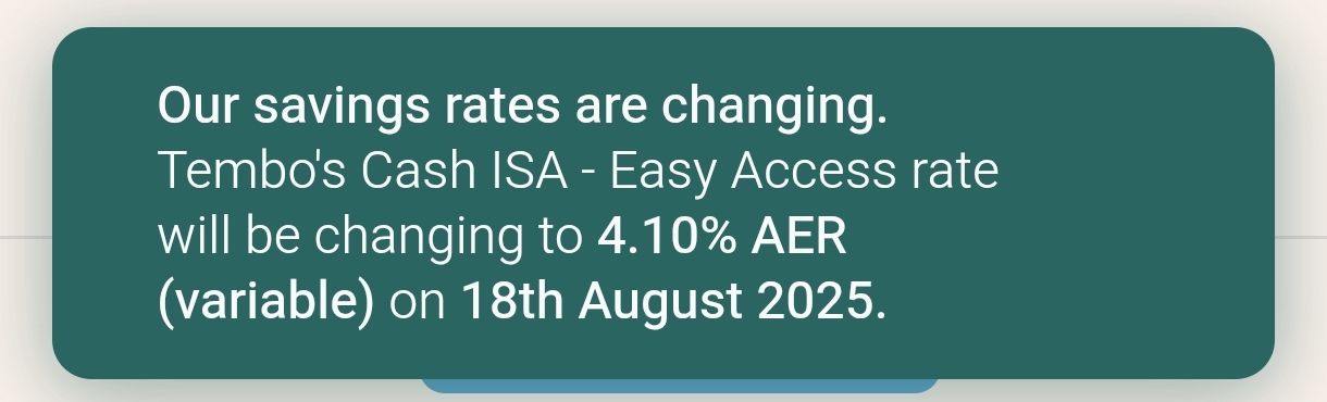 Tembo cash ISA showing now as “N/A %” in the app, suggesting to me they are about to reduce it. Most of my ISA funds are currently in Chip which is, for now, holding onto 4.96% AER with 0.9% 12-month bonus.