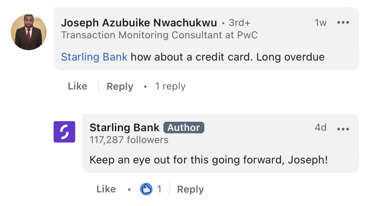 Is there a Starling credit card in the offing? This is a response on LinkedIn to people voting on which additional categories should be added.