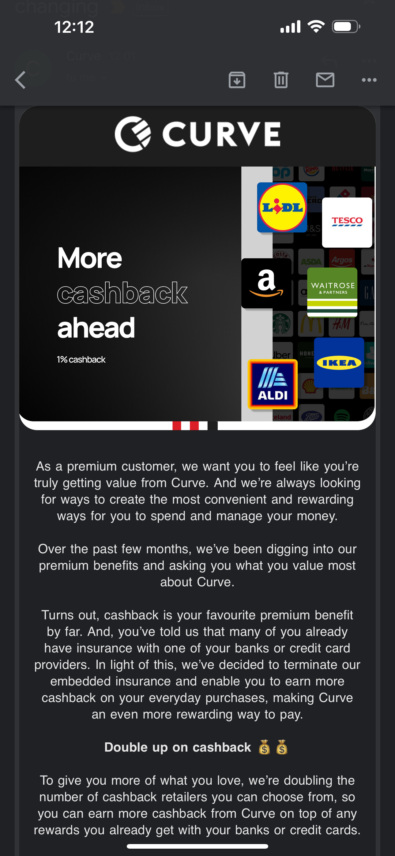 Biggish news about Curve benefits. They’re discontinuing embedded insurance (‘cos banks do it anyway) and doubling the cashback offering.